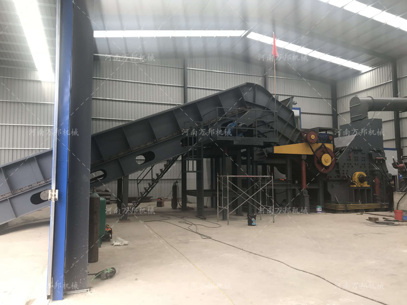 在工作流程上,通過(guò)上料輸送裝置金屬壓塊被送入設(shè)備強(qiáng)制喂料和破碎口,通過(guò)壓輥和粗碎軸的破碎加工將金屬壓塊進(jìn)行初級(jí)破碎,經(jīng)過(guò)初級(jí)破碎后的金屬壓塊料進(jìn)入設(shè)備主機(jī)腔,在高速大扭矩電機(jī)的驅(qū)動(dòng)下,主機(jī)轉(zhuǎn)子上的錘頭輪流擊打進(jìn)入主機(jī)腔內(nèi)的金屬壓塊料通過(guò)襯板與錘頭之間的空間,待破碎壓塊在破碎腔內(nèi)可得到充分而有效的細(xì)碎,將待破碎物壓塊撕裂成合乎規(guī)格的破碎物后,從篩網(wǎng)中流下來(lái)。破碎物料經(jīng)過(guò)空氣回旋分揀系統(tǒng),把金屬金屬壓塊中的油漆、鐵銹、廢舊塑料進(jìn)行分離,在設(shè)備底部卸出的物料再通過(guò)輸送設(shè)備運(yùn)送到集料點(diǎn),在此過(guò)程中物料中含有的非磁性物料在磁選機(jī)的作用下被分選卸出生產(chǎn)線落至非磁性物料料堆。另外整個(gè)系統(tǒng)裝有除塵裝置,將生產(chǎn)過(guò)程中產(chǎn)生的粉塵污染危害降至最低。該設(shè)備主要有產(chǎn)量高、能耗低、效率高、出料細(xì)碎均勻等優(yōu)點(diǎn)。并且在使用該設(shè)備時(shí),噪聲低、無(wú)污染,操作簡(jiǎn)單、維護(hù)方便。